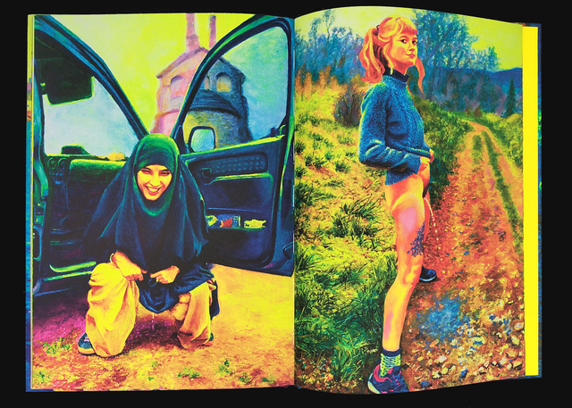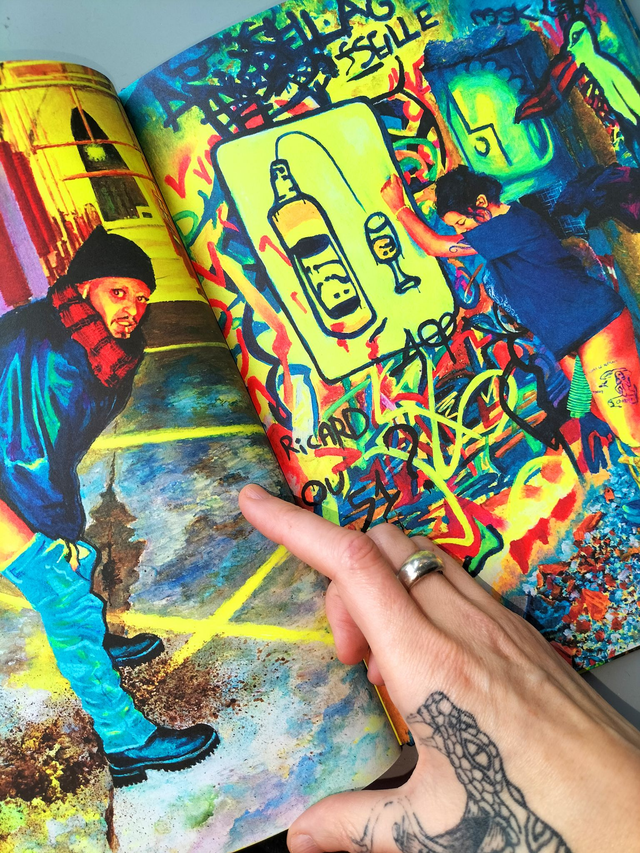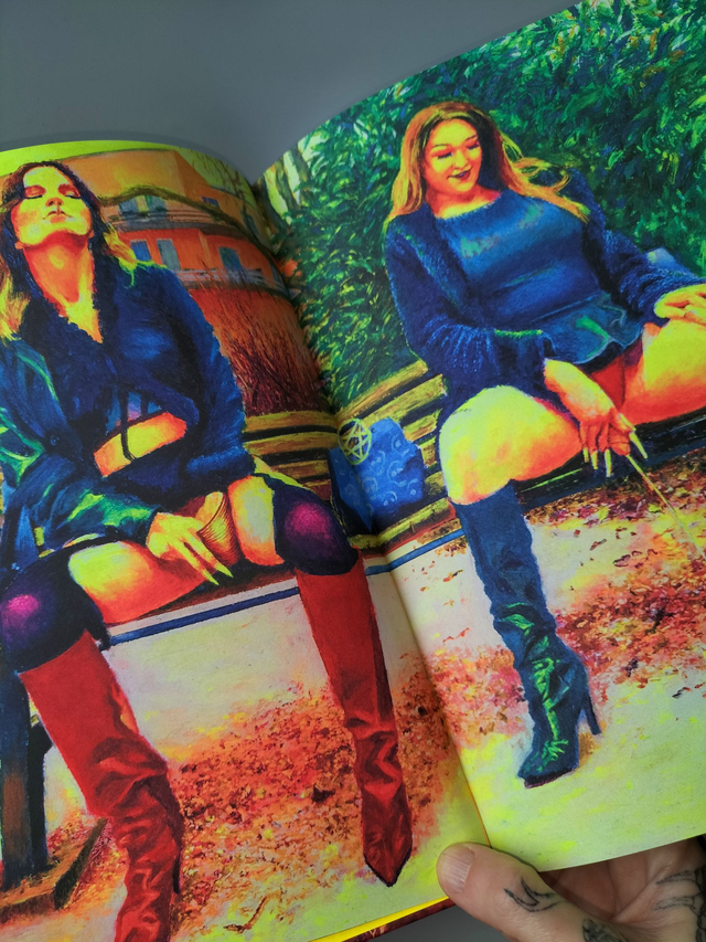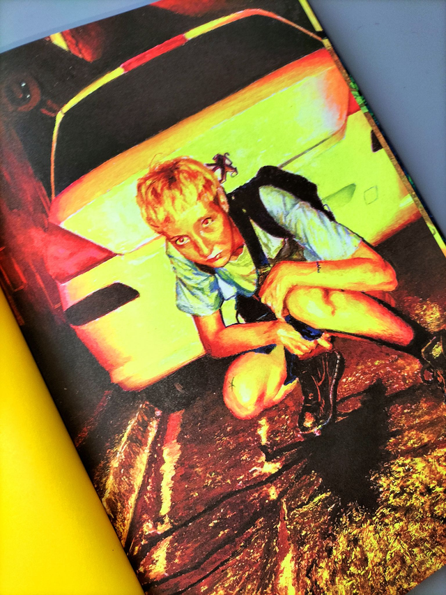 Vingt-cinq dessins aux pastels à l’huile. Un texte de fiction/miction. Impression encres offset fluorescentes.